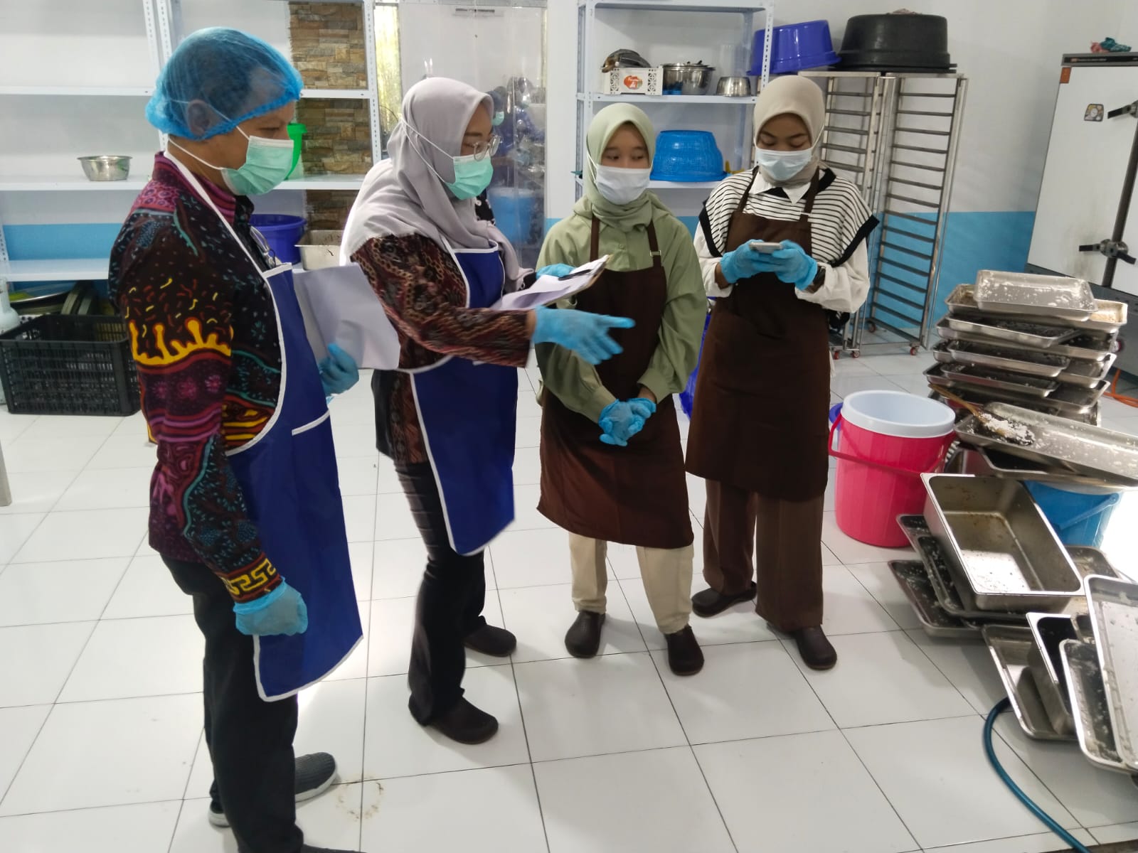 Kebersihan petugas dapur, termasuk penggunaan alat pelindung diri (APD) seperti celemek dan penutup kepala.