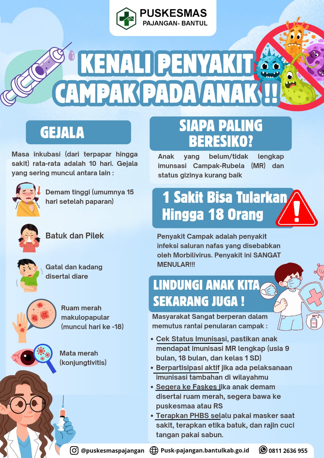 Campak adalah penyakit infeksi yang sangat mudah menular dan sering menyerang bayi serta anak-anak. Penyakit ini disebabkan oleh virus dan menyebar melalui percikan batuk atau bersin dari penderita.