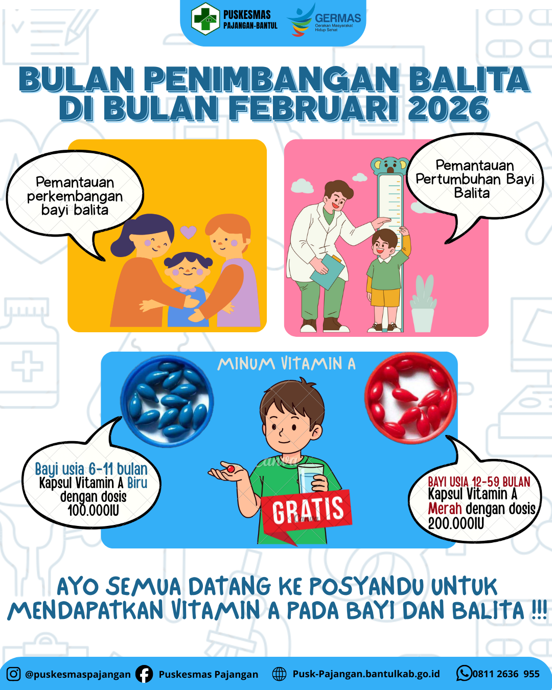 Selain ada hari Kasih Sayang, di Februari ternyata jadi Bulan Penimbangan lho..khususnya buat warga yg memiliki putra putri bayi balita. Selain menjadi bulan Penimbangan, Februari juga menjadi bulan suplementasi Vitamin A setiap 6 bulan sekali.