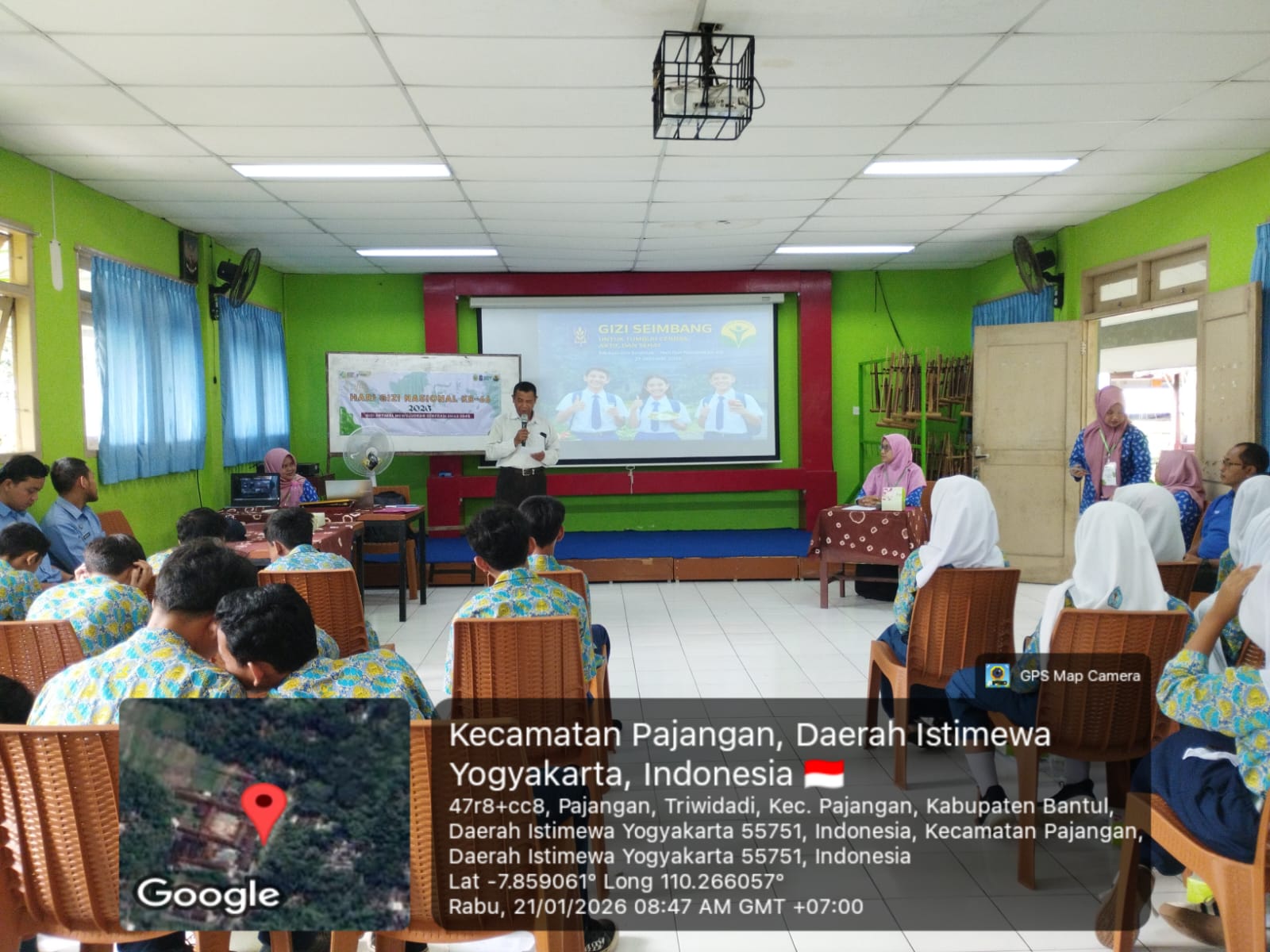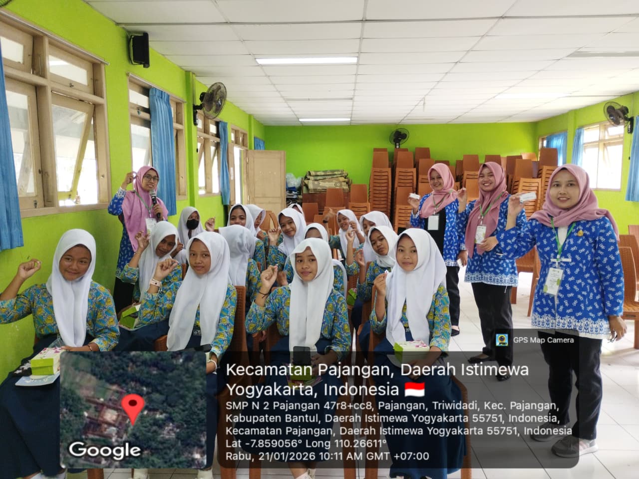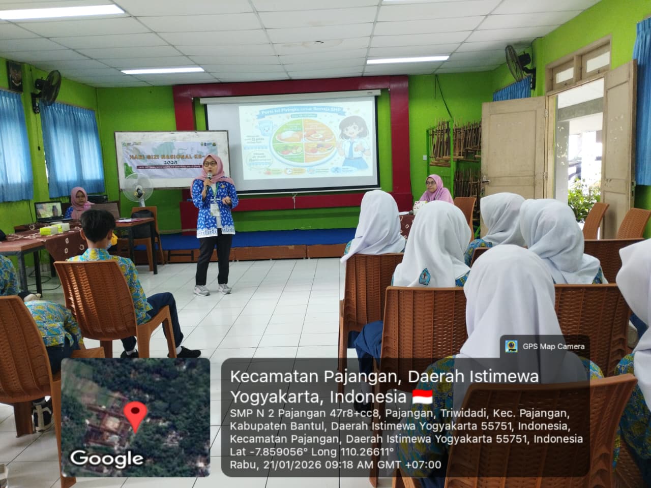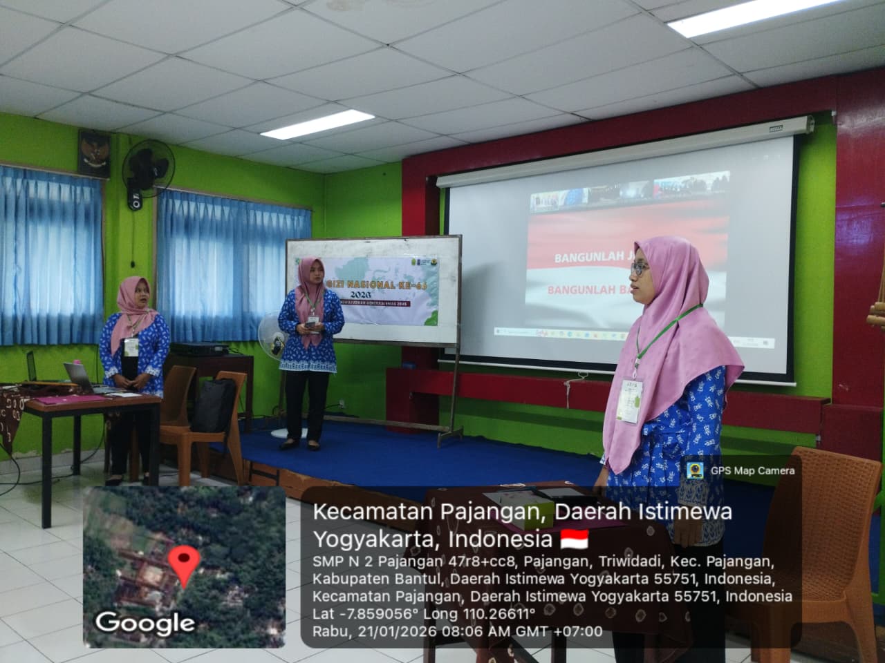 Pelaksanaan edukasi serentak di SMP 2 Pajangan dimulai dengan registrasi peserta pukul 7.15 dan dilanjutkan dengan mengikuti rangkaian pembukaan dari DPP. Pembukaan lokal di SMPN 2 Pajangan dimulai pukul 08.30 dengan MC Nanik Tejowati,SST. Dilanjutkan dengan sambutan DPC Persagi Bantul oleh Salma Fajria Hairin, S.Tr.Gz.RD. dilanjutkan Sambutan Kepala Sekolah SMPN 2 Pajangan diwakili Wakil Kepala sekolah urusan Kurikulum, Kadarman, SPd, MPd dan dilanjutkan pemberian Sertifikat dari DPP Persagi dengan petugas Utami Eko Astuti, A.Md.Gz.