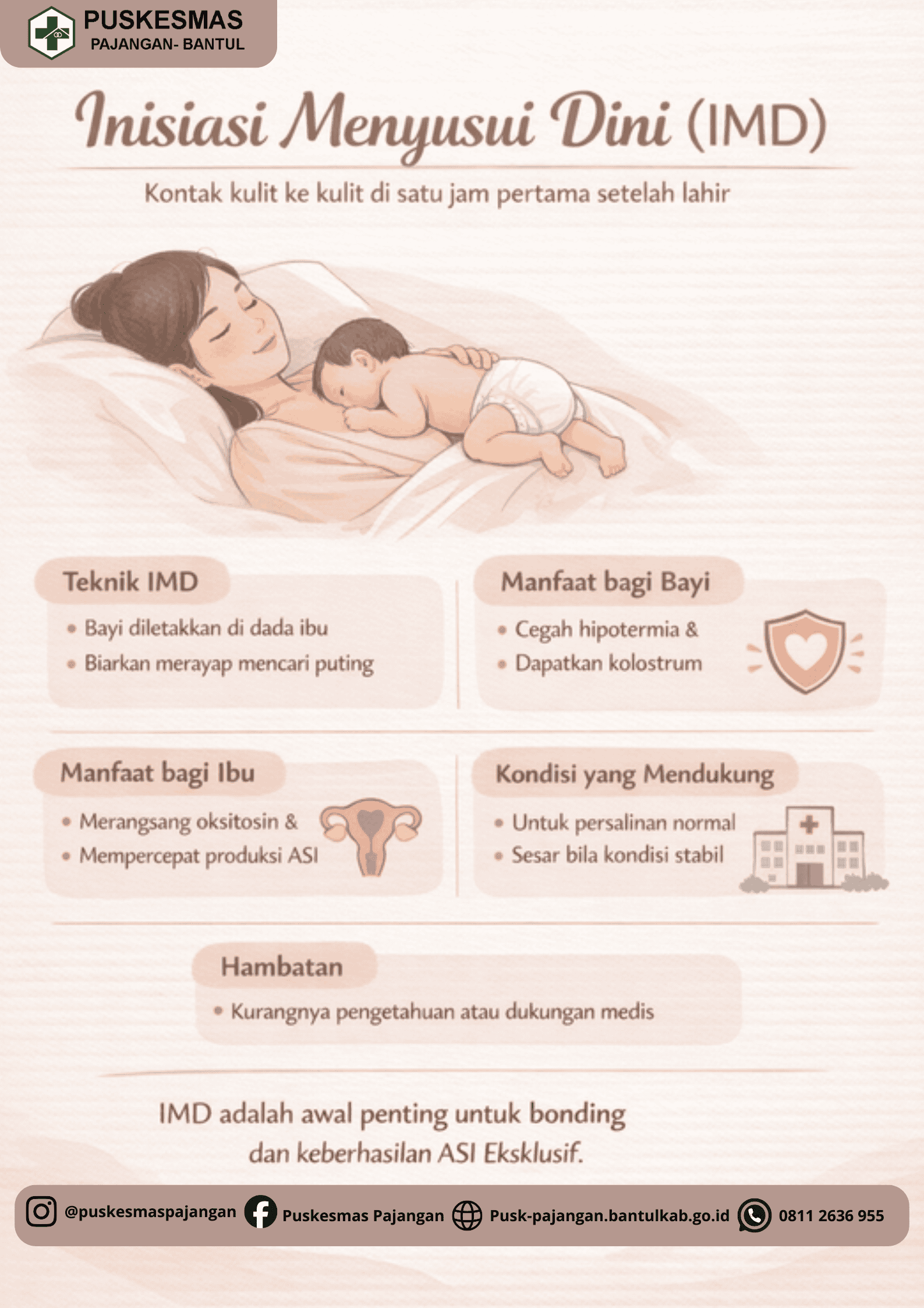 IMD (Inisiasi Menyusui Dini) adalah proses membiarkan bayi baru lahir menyusu sendiri dalam 1 jam pertama setelah lahir melalui kontak skin-to-skin (kulit ke kulit) dengan ibu.